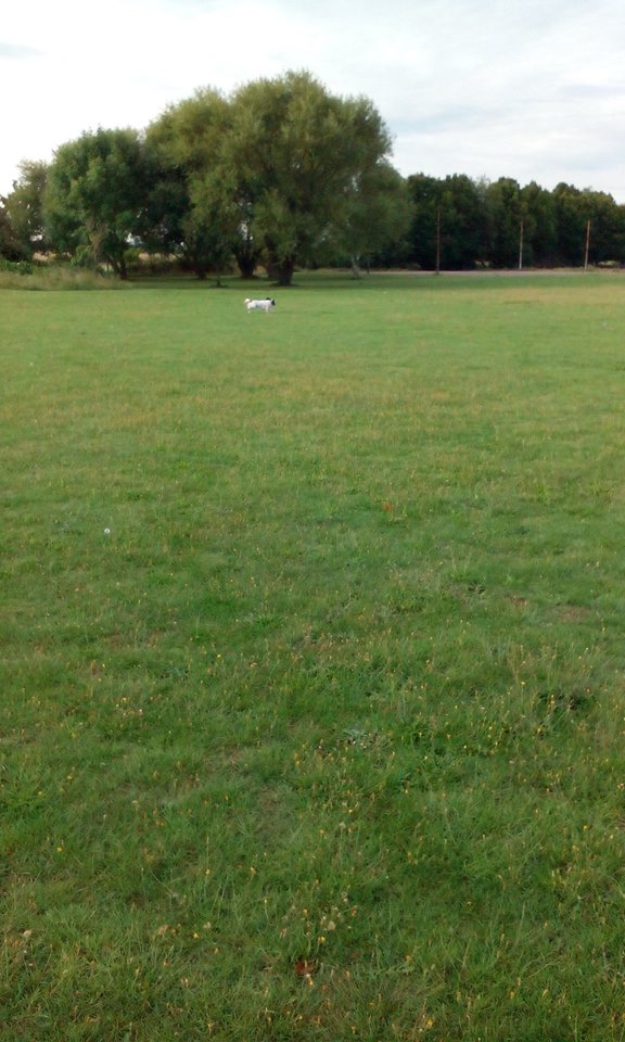 Pic 1 iz me waitz patientz for Hoodad to launch da first ball of da day. Pic two iz me running da deafies out me earziez, I iz da white dot in da distance. Dont fink I did a good job coz Hoodad shouted and put me in da figure of hate before da end of da park.