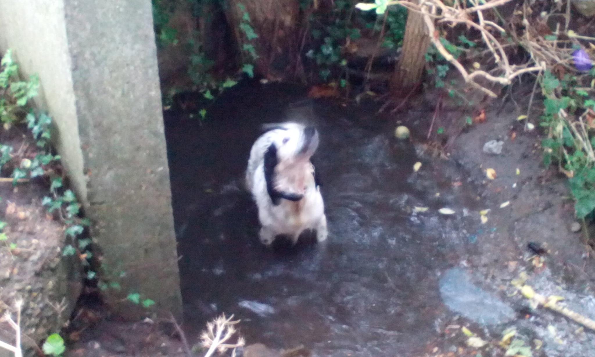 Just to punish himz I left da third in da stinky pond, it waz well funniez watching him slide down to get it. Pic 1 shows me going back in, after he gotz da ball, and laughing at him.