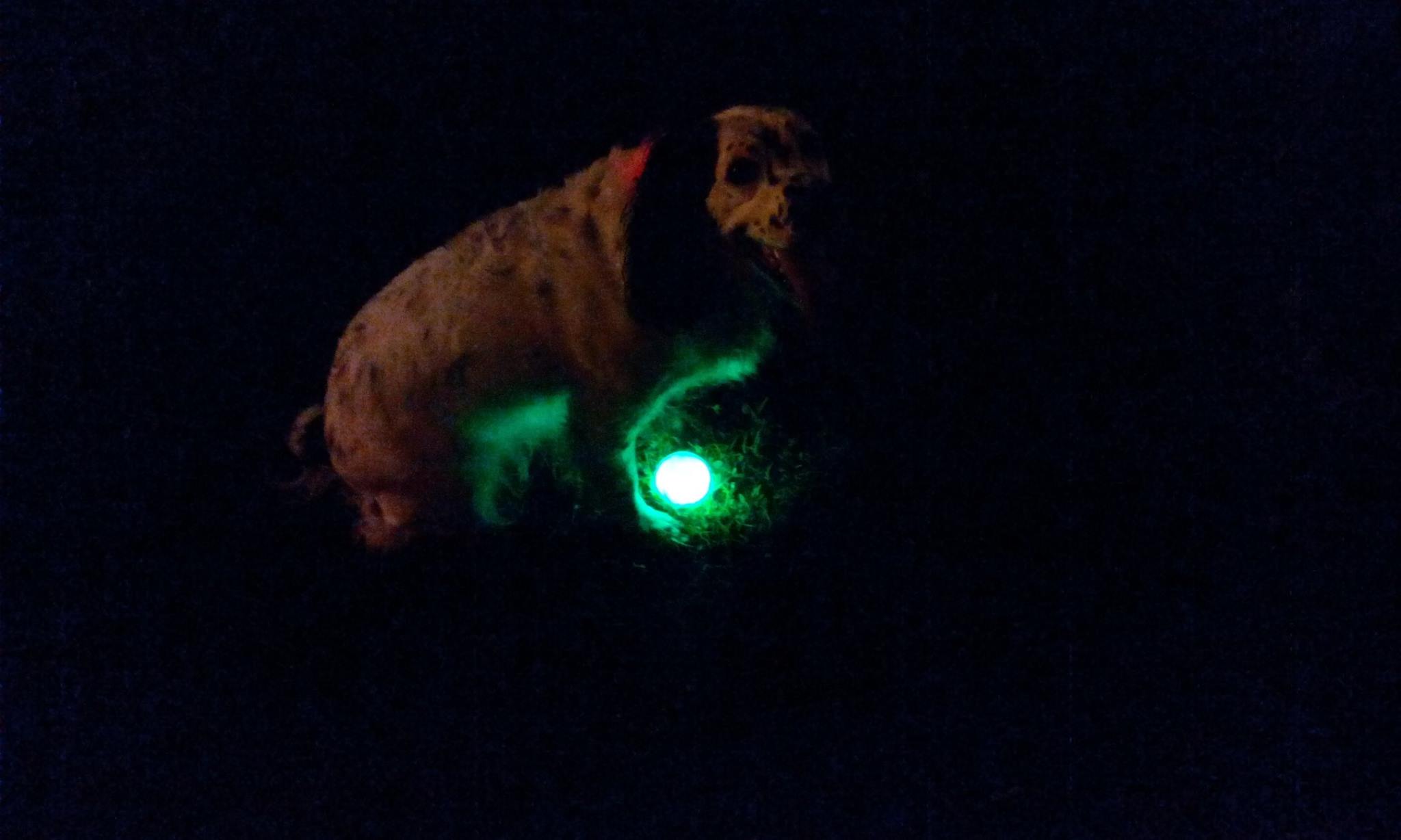 Hoodad took me and my glow balls out on Thursday night and we had ball fros in da dark, It waz ACE. I findz dat if I holdz da ball in my mouth I can use like a torch, and dis meanz I can findz even more yummy Scooby Snax when its dark. I luvz my glow balls.