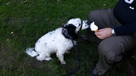 Well I haz da best ever walkiez in Westley Heightz. Da Hoominz double team me wiv da girlie coloured balls on string fingz. I waz well cream crackerd by da finish that at da end of walkiez I sitz down for a rest. Hoomum put da figer of hate on me and da Hooda goes to da Nom Nom van in da car park. Den da best bit happenz I haz a whole Ice creamz to me not just da Hoodad overleftz. It waz lush I gobblez it up cone and all in da double quick time. I just wantz to know why I haz to wait till I iz four and a half Hoomin yearz for me own icecream ? Pic one and tow iz me an me Icecreamz.
