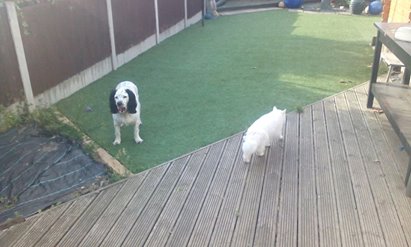 I iz glad to say normal service iz now restored it iz Saturday an da Fatbloke is up early an readying his old bonez for da ball frow. Pic 1 iz me an Baby enjoying being back in our garden an haz a bit of a yawn in readiness for ballfrow. Pic 2 iz me waitz for Hoodad to be ready. Den we iz off.