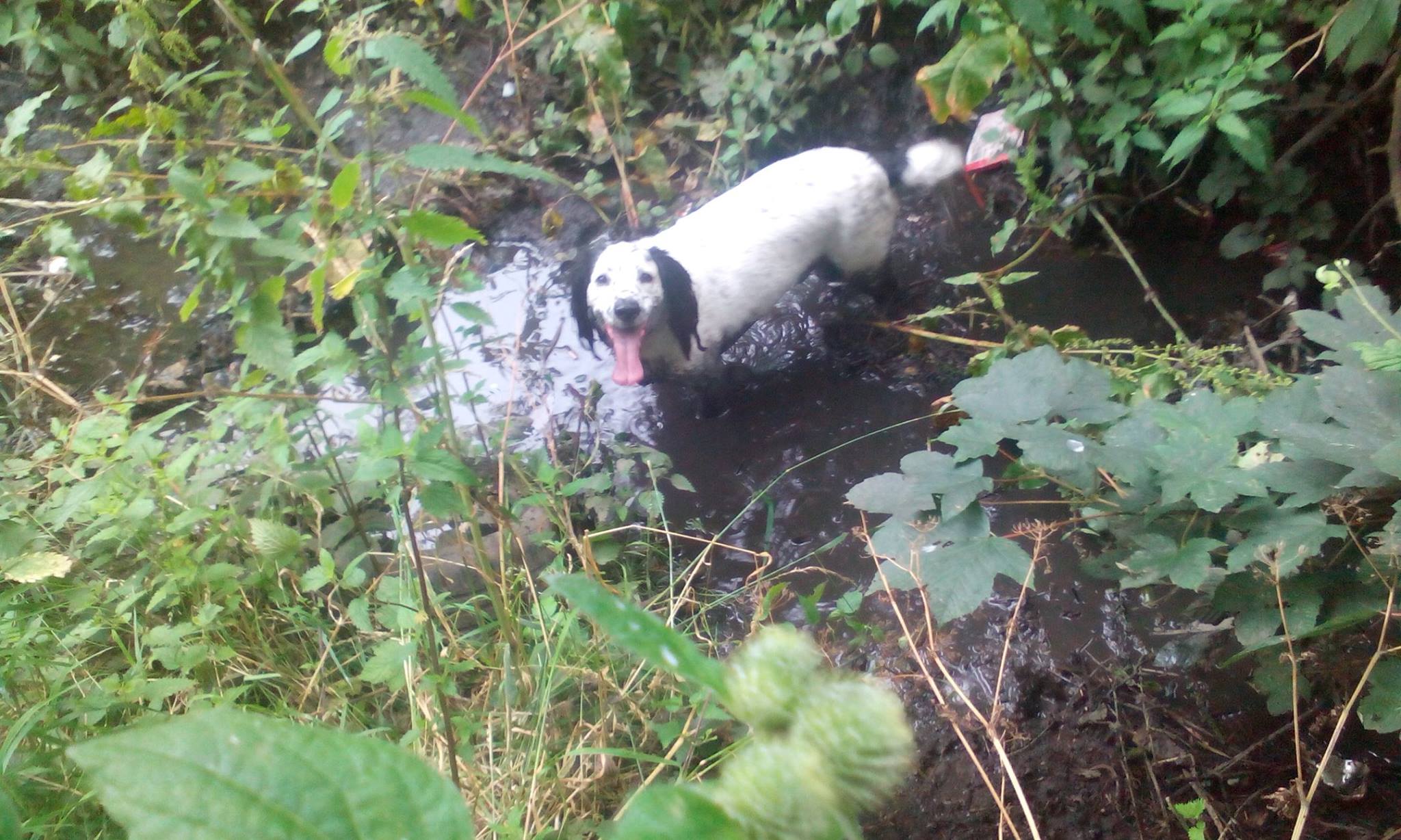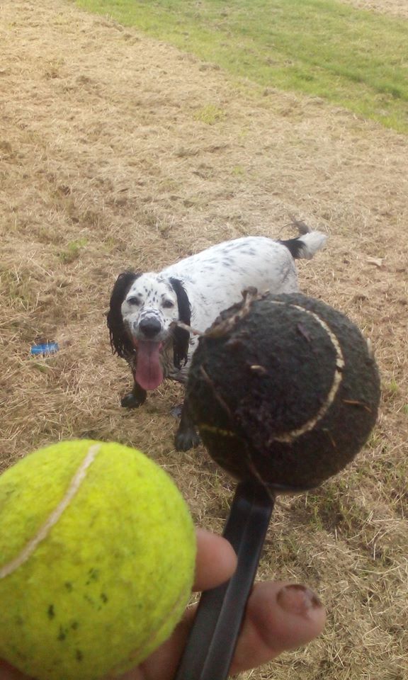 On da ballfrow today I discoverz da new extra extra stanky bit to dive in, how I haz missed diz I not no I haz been in da park for 4 yearz an did not know it waz dere. Pic 3 and 4 iz me enjoy da stank. Coz Hoodad iz getz quicker at da huffy puffy leaky fing he waz shout me to come out well before I waz ready. I waz forced to do tda drop da ball so it roll back in to havez more fun. He must be mellowing in hiz old age az it took me 10 dropz before he waz red in da face an haz da angry vein on hiz head. Pic 5 iz da sate of da tennis ball after all da dropz. You can see me looking well pleased wiv meself.