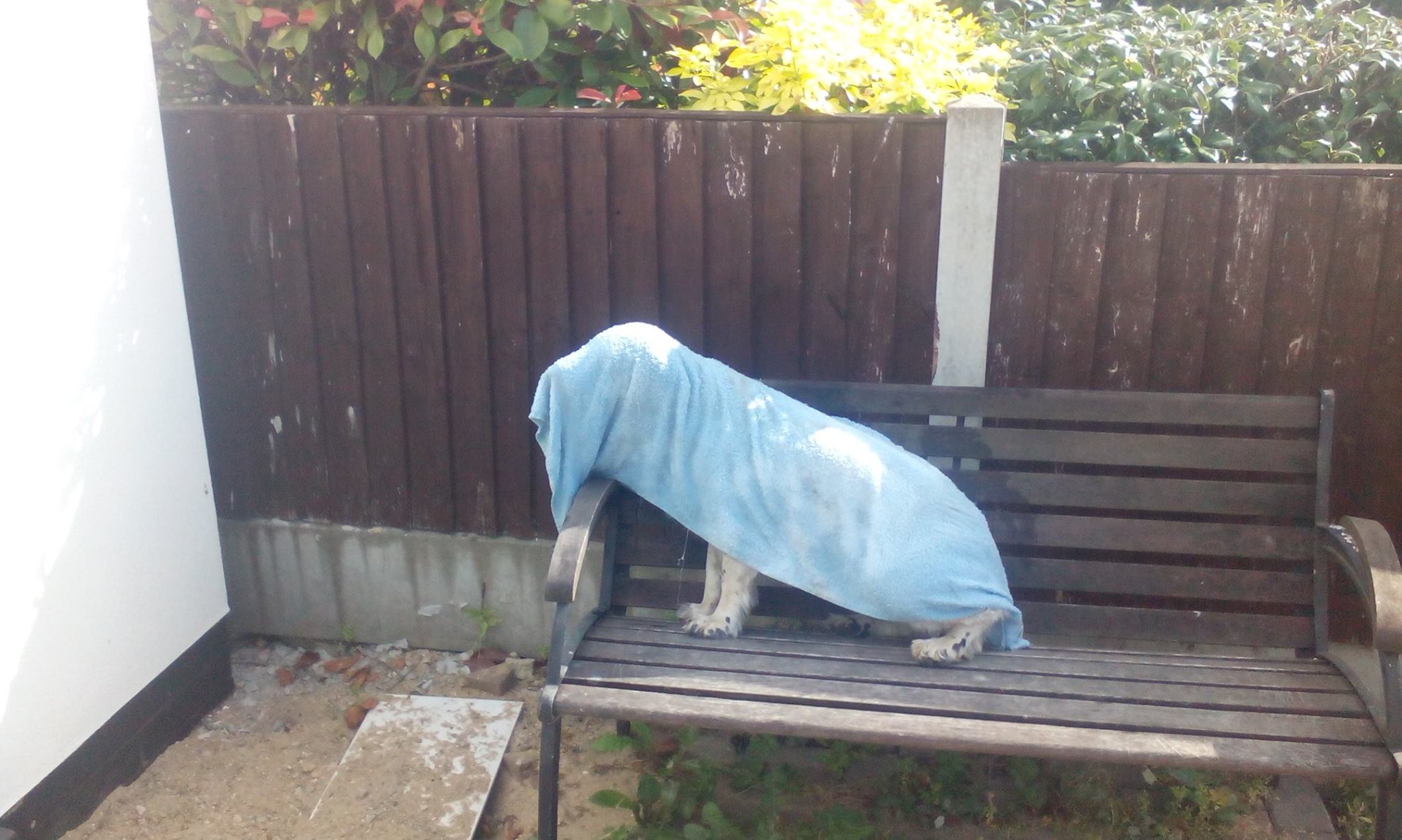 Pic two iz me looking well happy in me muddy puddle, I waz annoyed at meself az I forgot da two well stanky places. Butg it waz well sunny an I waz being full turbo mode earz back an everyfing. I waz so tired dat Hoodad beatz me along da manorway!!!! Pic 3 is me relax under da damp towel, it waz loverly.